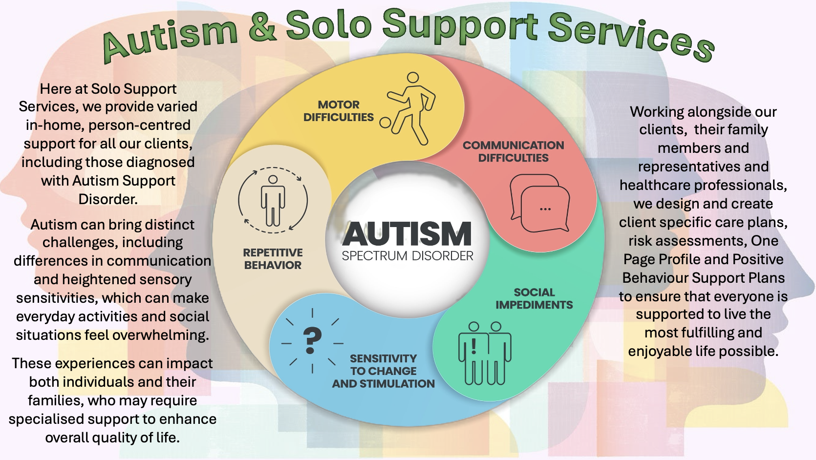 Here at Solo Support Services, we provide varied in-home, person-centred support for all our clients, including those diagnosed with Autism Support Disorder.